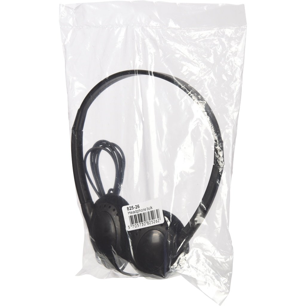 Standard music headphone with foldable earcups. Suited for airlines, trains, busses, hospitals, cinemas etc. Bulk packed, min. order 100 pcs.